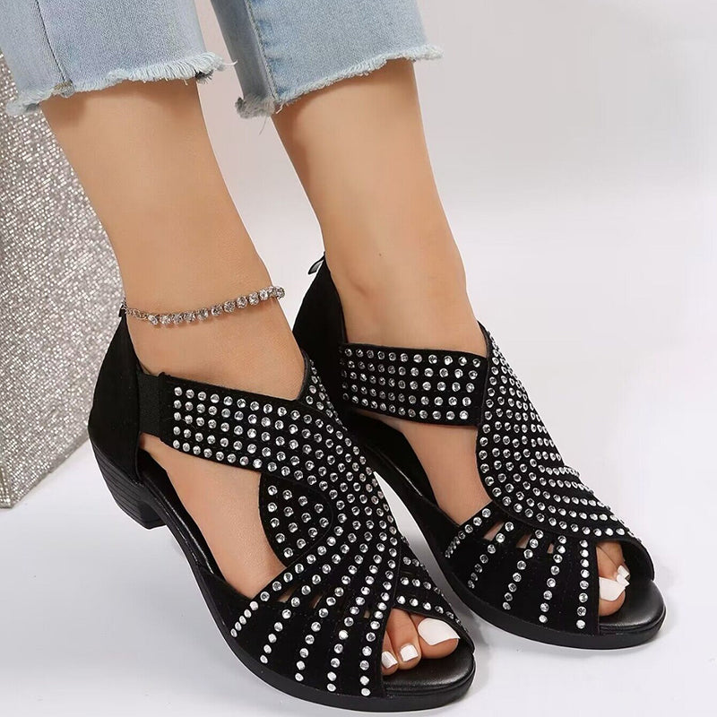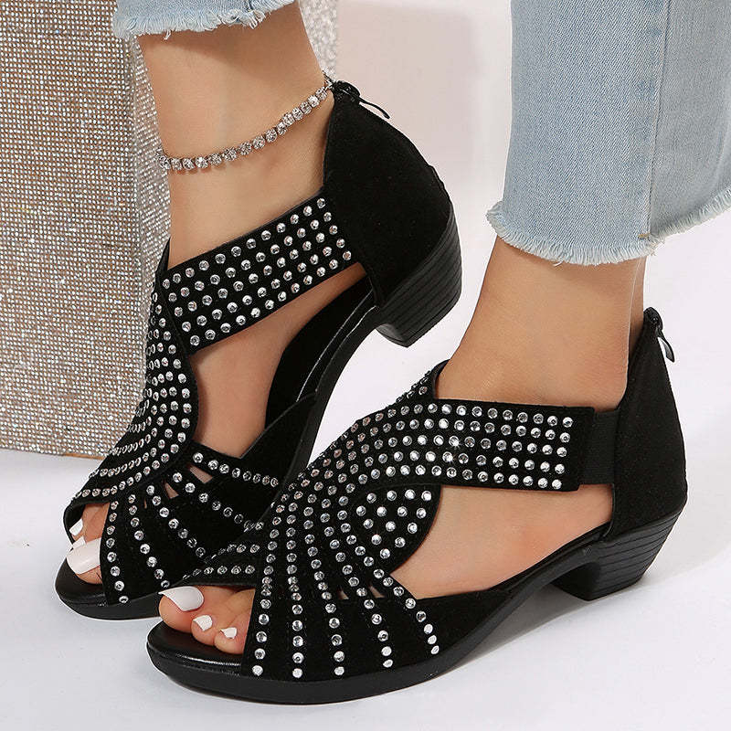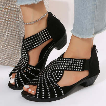 Black rhinestone cut-out chunky heels sandals