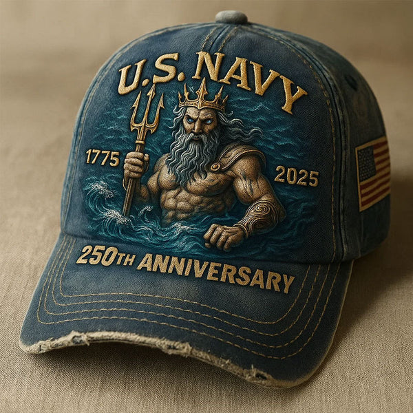 Mark 250 years of naval excellence with this exclusive collection of US Navy anniversary caps. Each hat is a tribute to the enduring spirit of service and sacrifice. Featuring intricate embroidery of maritime icons—Poseidon, anchors, tall ships, and American flags—these caps are designed to honor tradition while making a bold patriotic statement.